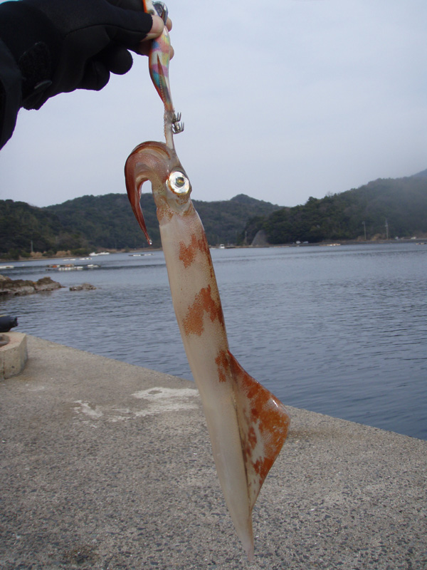 昼頃になって、強風が吹き始め、フカセ釣りが厳しくなってきましたので、風裏の湾内をエギングで攻めてみました。