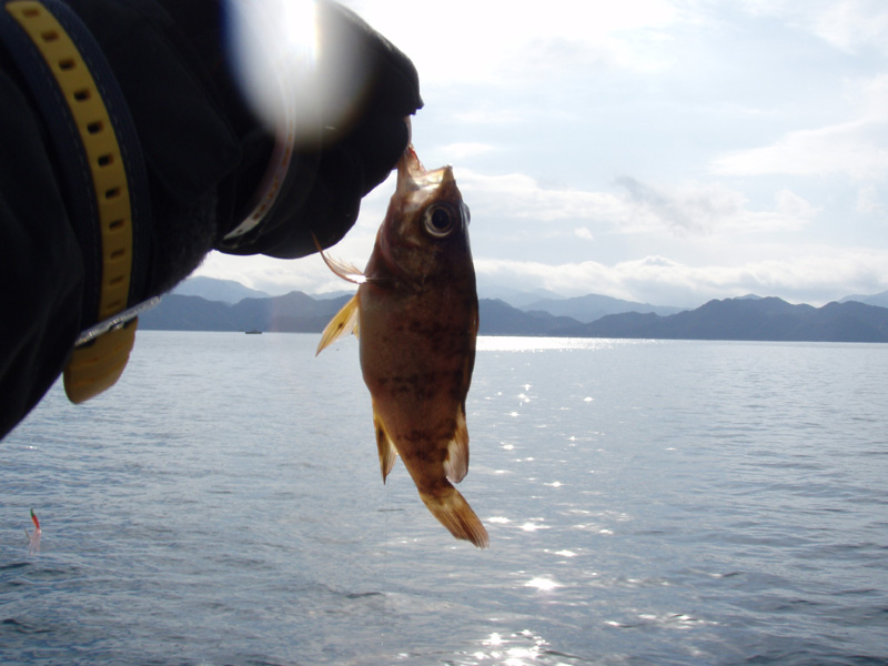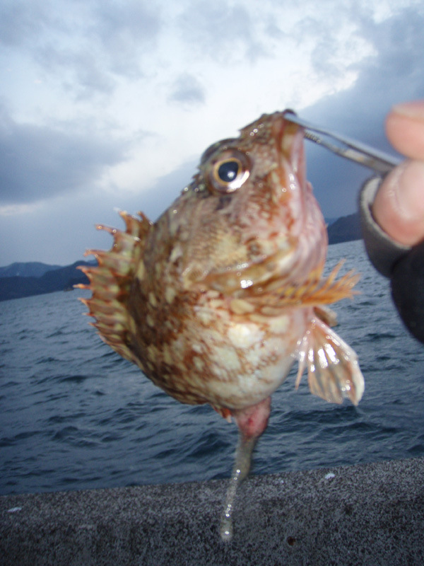 何かおる!と確信し、再度アジをセットして、キャスト!今度は鈴も付けず、じっと竿先を見ていると、ググッと竿先が入りました。がっ、ここは焦らず、喰い込むまで我慢し、さらに竿先がググッと入ったところでアワせてみると、まあまあのサイズのカサゴがあがってきました!やったーーー!こりゃうめぇぞ~ハッハッハッ。