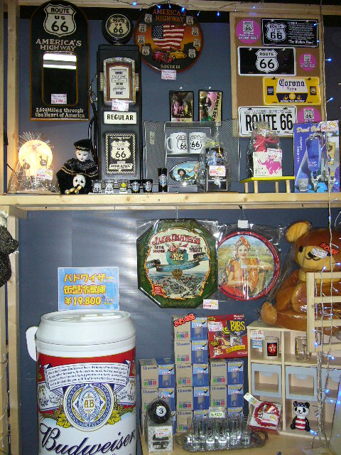 その他、ショットグラス・マグカップ・ライセンスプレート・木製ミラーetc...Coca-ColaやCoronaグッズ・Moonのビアジョッキーなんかもコラボってクールなコーナーにしてみたよ