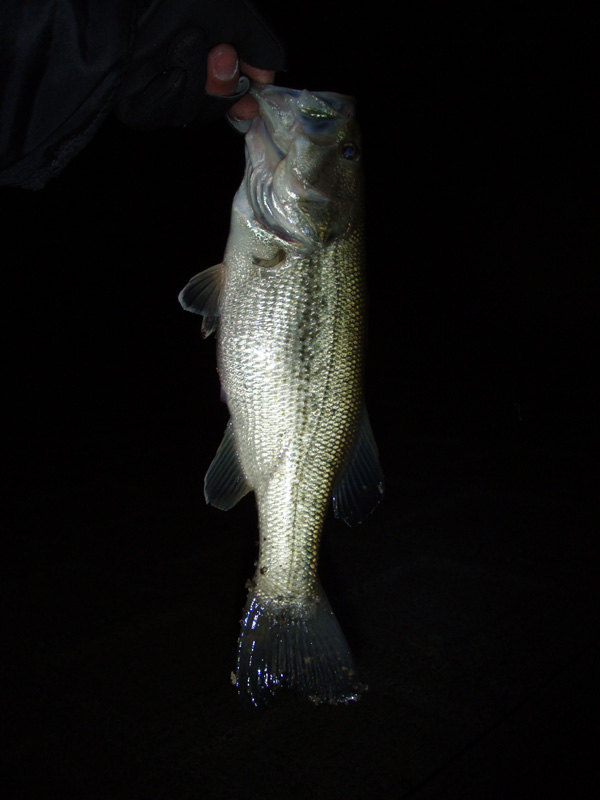 どうせ真っ暗なので目を閉じてルアーを操っていると、またもショートバイトが。それを電撃フッキングでアワせ、何とか32cmのバスをGETしました。