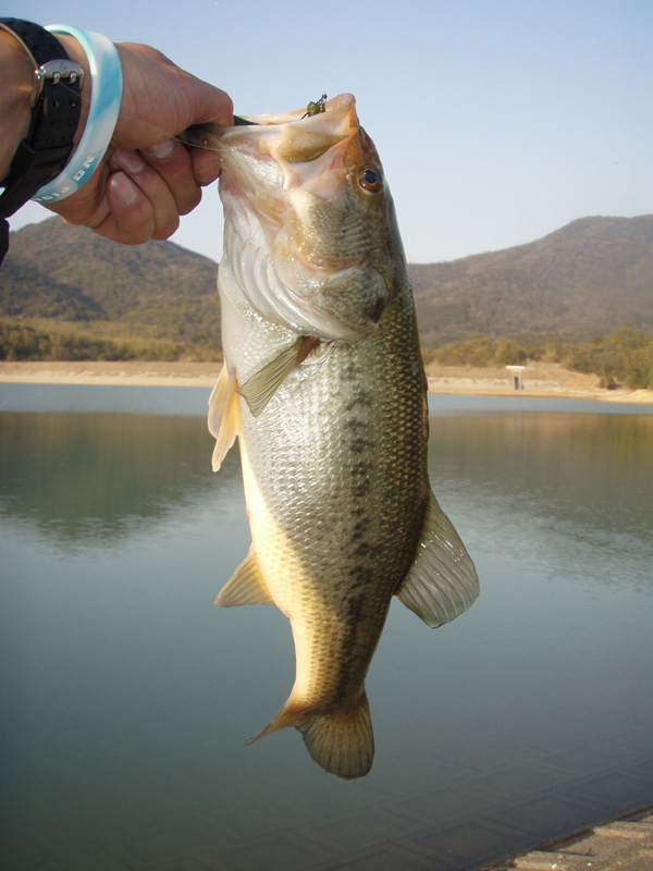 しかし、いまだ水温は低く、バスたちの活性もイマイチです。午後3時ごろから釣りはじめ、池を半周したところでようやく始めてのアタリが!すかさずフッキングし、ジャンプ&エラ洗いをねじ伏せ、45cmのバスをゲット!!